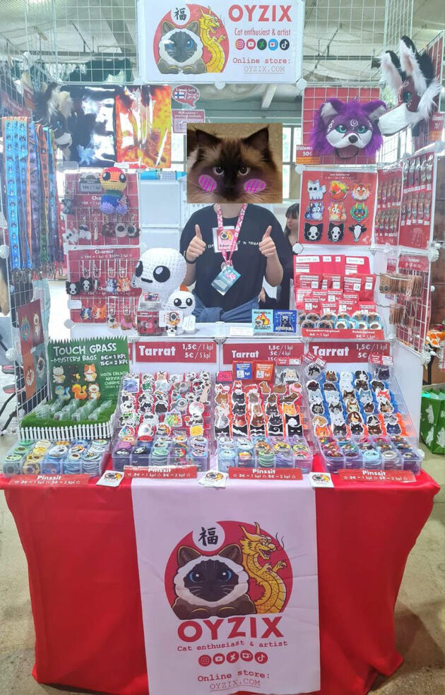 Oyzix on ollut myymässä itse suunnittelemiaan tuotteita (tarrat, pinssit ym.) neljässä tapahtumassa: Gingacon Tampere 24, Shumicon Shoppu Helsinki 24, Konekocon Kuopio 25 ja Hypecon 25! Tuotevalikoimaan pääsee tutustumaan verkkokaupassa Oyzix.com!